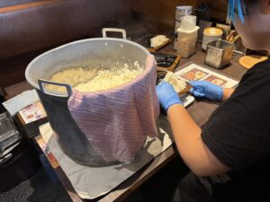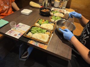 やったことは、お弁当の中身を詰めたり、大きな鍋からソースをボトルに入れ替えたりと、簡単な作業が中心でした。